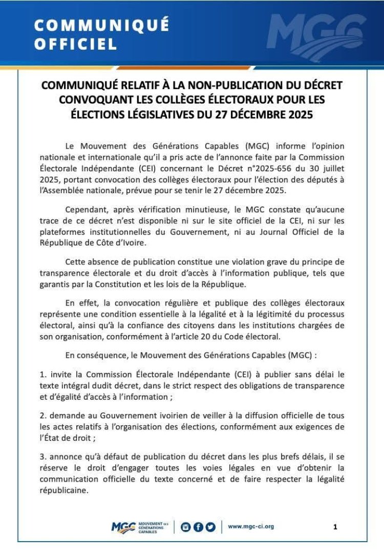 Le Mouvement des Générations Capables (MGC) informe l'opinion nationale et internationale qu'il a pris acte de l'annonce faite par la Commission Électorale Indépendante (CEI) concernant le Décret n°2025-656 du 30 juillet 2025, portant convocation des collèges électoraux pour l'élection des députés à l'Assemblée nationale, prévue pour se tenir le 27 décembre 2025.