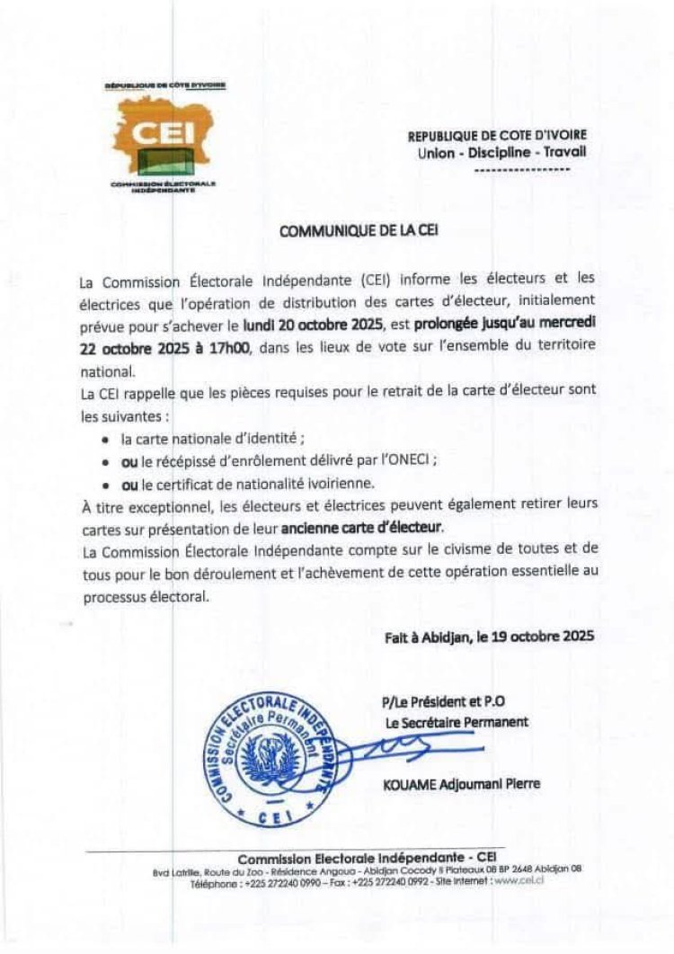 La Cei (Commission électorale indépendante) a rendu publique, une note prolongeant la date de distribution des cartes d’électeur, au mercredi 22 octobre 2025 à 17h00. Cette opération devait s’achever lundi 20 octobre 2025.